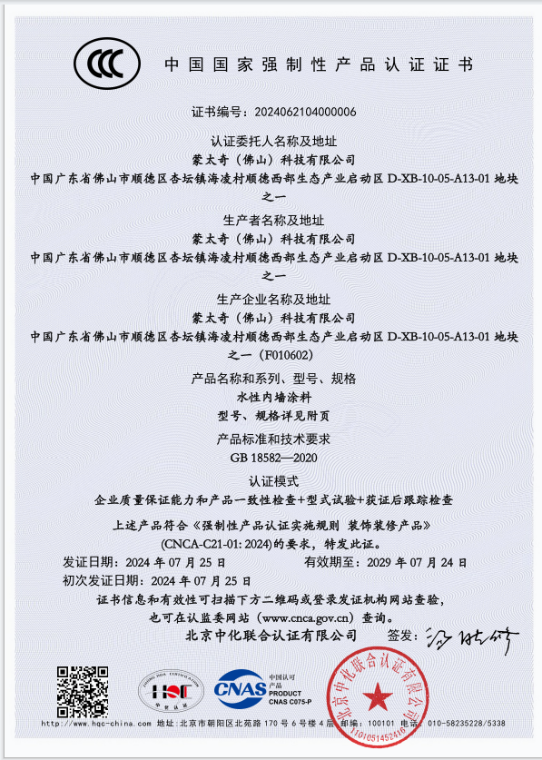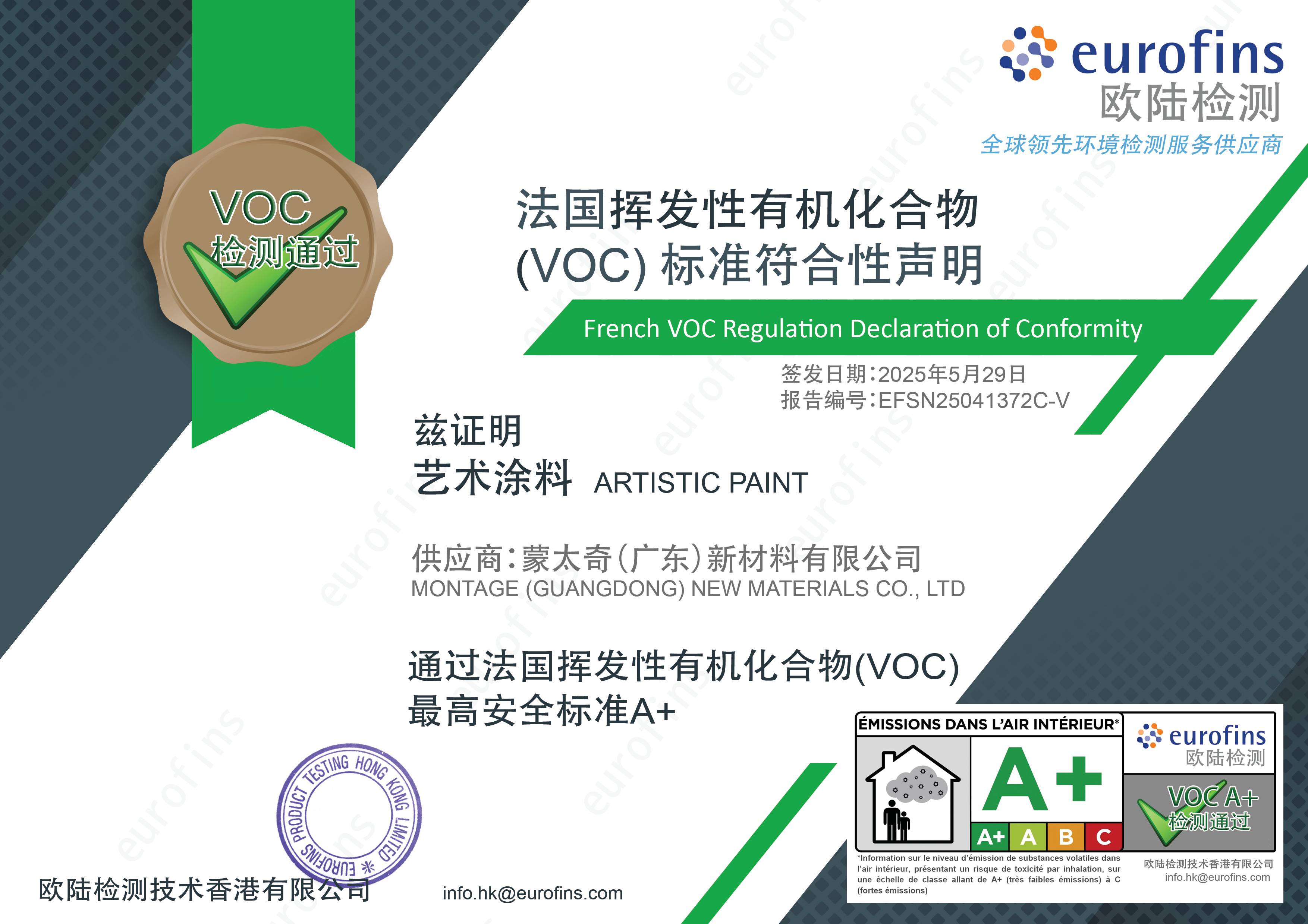 水性内墙涂料3C认证:蒙太奇艺术漆作为国内首批通过《水性内墙涂料中有害物质限量》标准及3C强制性产品认证的双资质品牌,蒙太奇从源头把控甲醛、苯系物等有害物质含量,远低于国家标准限值,重新定义健康涂装新基准。